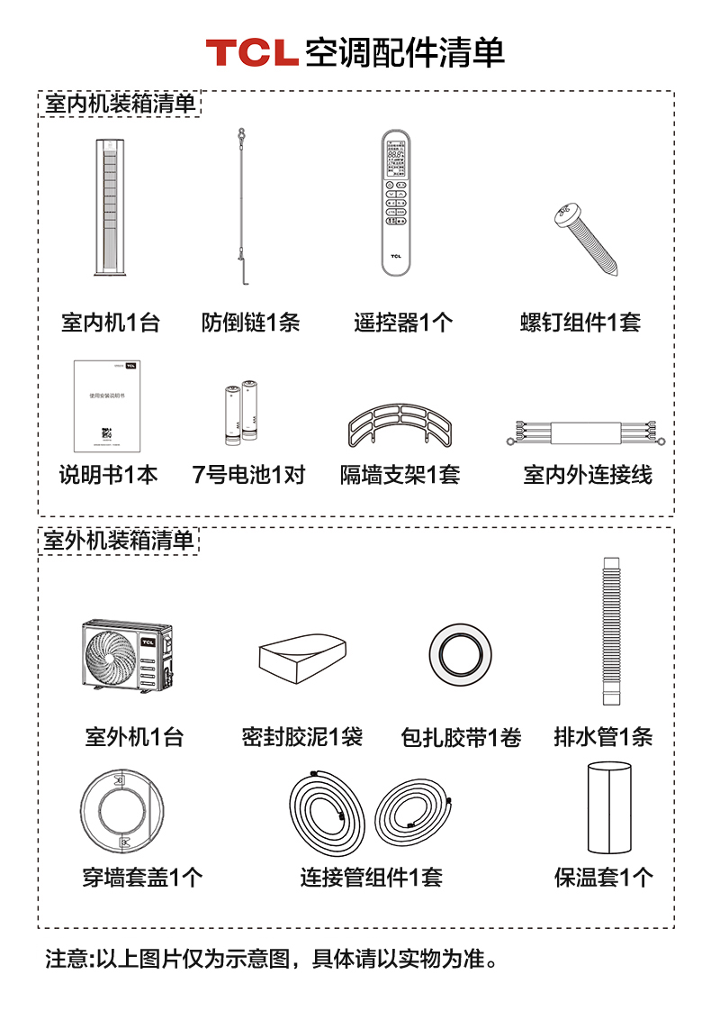 遥控器×1;说明书×1;保修卡×1;纯铜连接管×1;TCL空调室外机*1对应的室内机*1