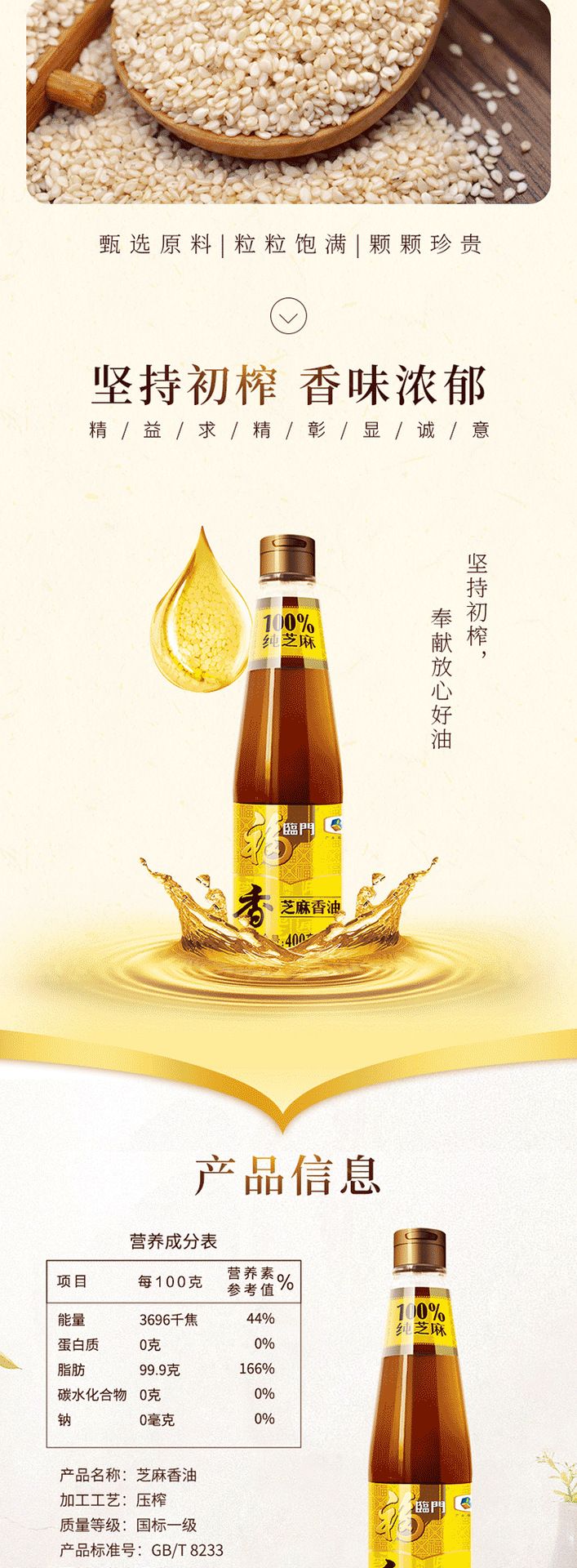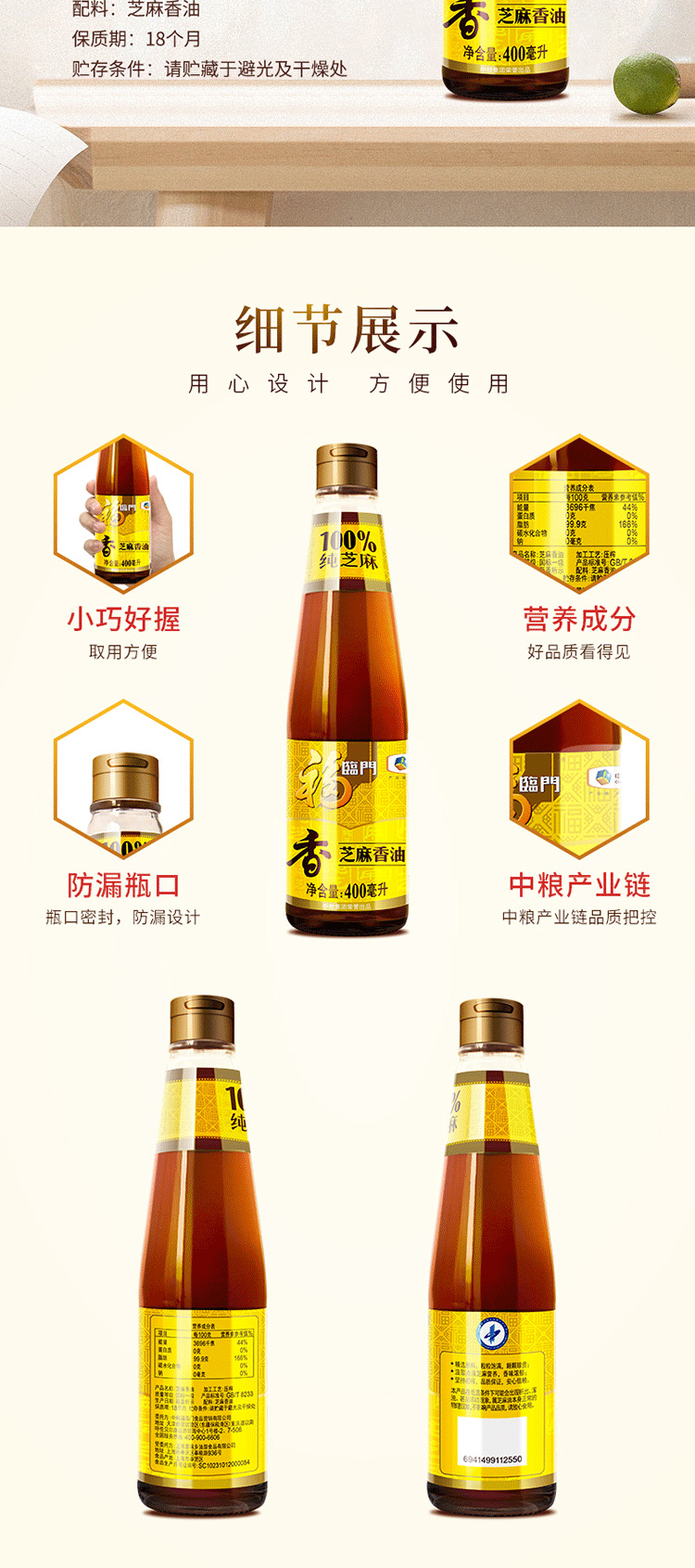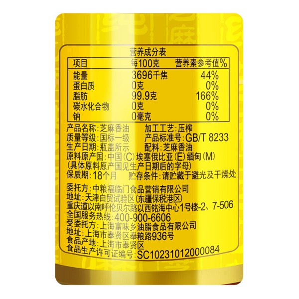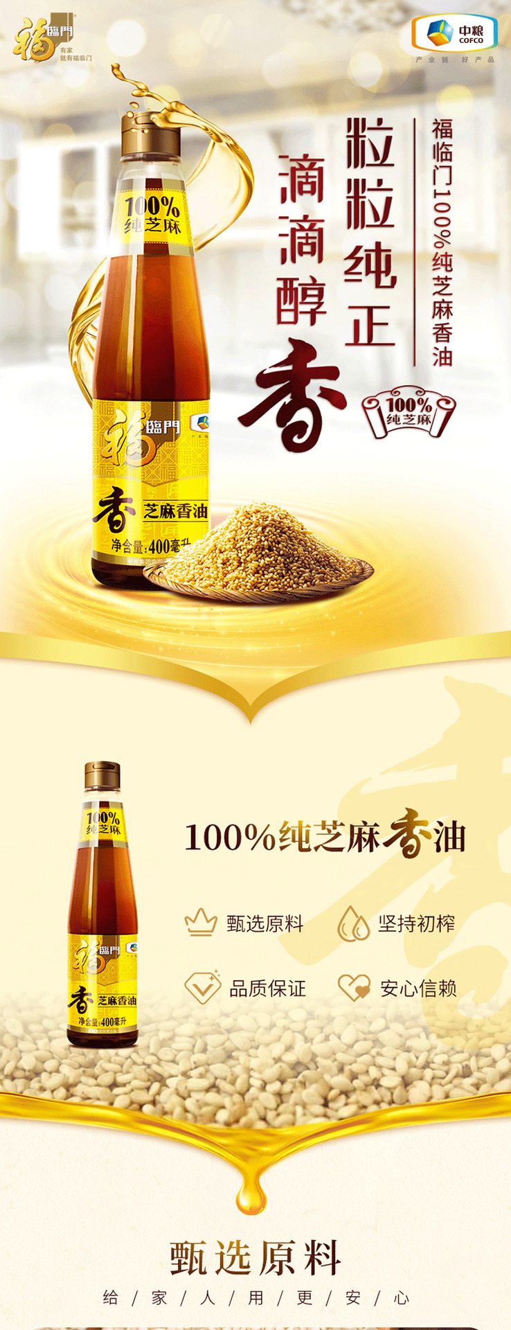 福临门 食用油 压榨芝麻油400ml 凉拌调味烹饪火锅 中粮出品