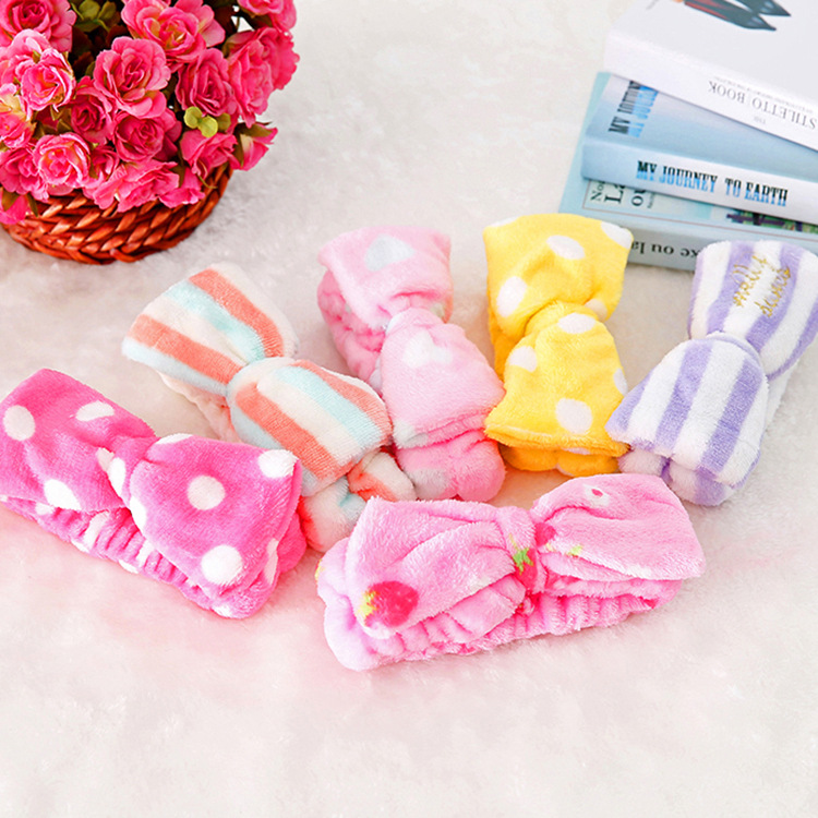 新款法兰绒蝴蝶结束发带波点条纹洗脸化妆美容束发带弹力防滑发带