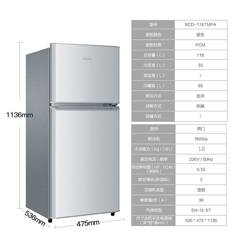 海尔(Haier)冰箱118升小型两门迷你双门冰箱宿舍家用租房小巧不占地节能冷藏冷冻BCD-118TMPA