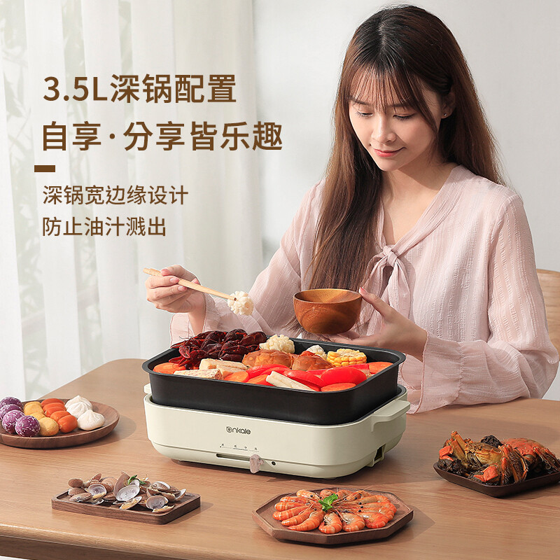 德国ankale 多功能料理锅家用大容量电煮锅烤涮一体电烤锅 米黄色升级款-【煎烤盘+深盘】 多用途电热锅