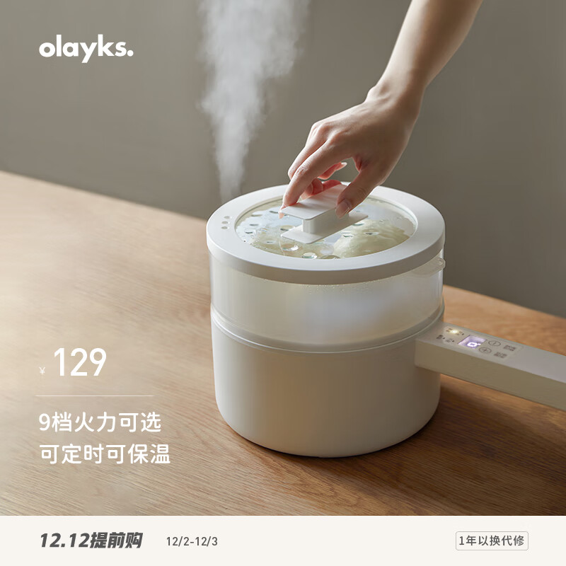 olayks出口原款2L多功能电煮锅泡面锅家用一人电火锅宿舍小锅电蒸锅煎涮单人迷你电热锅电脑款-配蒸笼