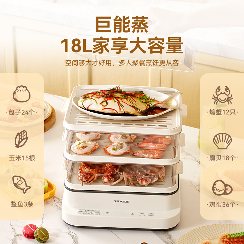 多多熊电蒸锅家用多功能三层小型蒸汽锅大容量透明可视化蒸箱早餐神器蒸蛋器可预约定时小早餐机 18L三层大容量 3层