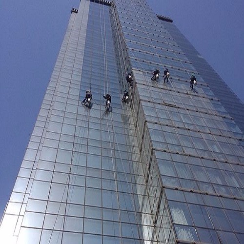 二、高空作业简介A、首先查看作业现场,确定作业方案。重点查看屋顶状况,确定能否安装吊篮、吊板,吊篮、吊板在屋顶移动有无障碍;霓虹灯、字牌有无防碍作业等。B、安装运载工具,如大厦已安装擦窗机,则按规范做操作前的检测。C、准备擦拭工具、清洗药剂。D、作业人员携带工具上吊篮或吊板,有些工具应拴在吊篮或吊板上,以防不小心失手落下,伤了行人。在地面设安全防护拦绳,或置安全警告牌。E、作业方式从上到下。每擦拭完一行,整理工具、加清洗剂、横向移动吊板或吊篮,再继续下一行作业。F、擦拭玻璃方法:1、检查玻璃上有无粘着物等污迹,如有,先用刮刀等相应辅助工具和溶剂除去。2、将涂水器浸入桶中,待充分吸入清洁剂后用手轻轻捋一下(以不往下滴水为宜),均匀涂在玻璃上。3、涂抹时,一般由上往下滚,横向移动,每趟滚迹要交叉相压,以防漏涂。4、用胶刮将玻璃上的清洁剂刮净,操作时应稍用力,将胶刮均匀按压在玻璃上,由上往下缓缓刮动,每刮完一行,用湿毛巾将胶刮擦拭干净再刮下一行。5、确认一次应作业范围内的墙面已清洗完毕,滑动吊篮或吊板继续往下作业。6、全部作业完成后,收拾整理设备和工具,撤离地面防护拦绳或警告牌,将地面水迹擦净。